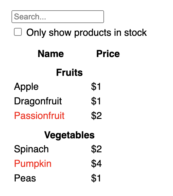 const [inStockOnly, setInStockOnly] = useState(false);Then, pass filterText and inStockOnly to ProductTable and SearchBar as props: